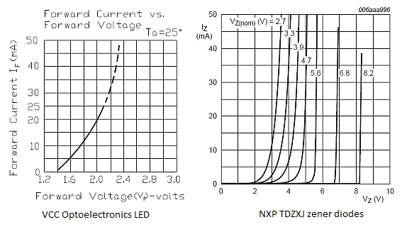 Observe the LED current-voltage curve on the left and the zener diode current-voltage curve on the right. You will notice that the zener diode has a steeper curve compared to the LED. Apparently to avoid blinding myself, I had limited the LED current to about 10 mA. I missed the fact that at 10 mA the voltage drop across the LED is now only ~1.8 V. To get 2 V across the LED, you need at least 20 mA, which would be too bright as an always-on indicator.
