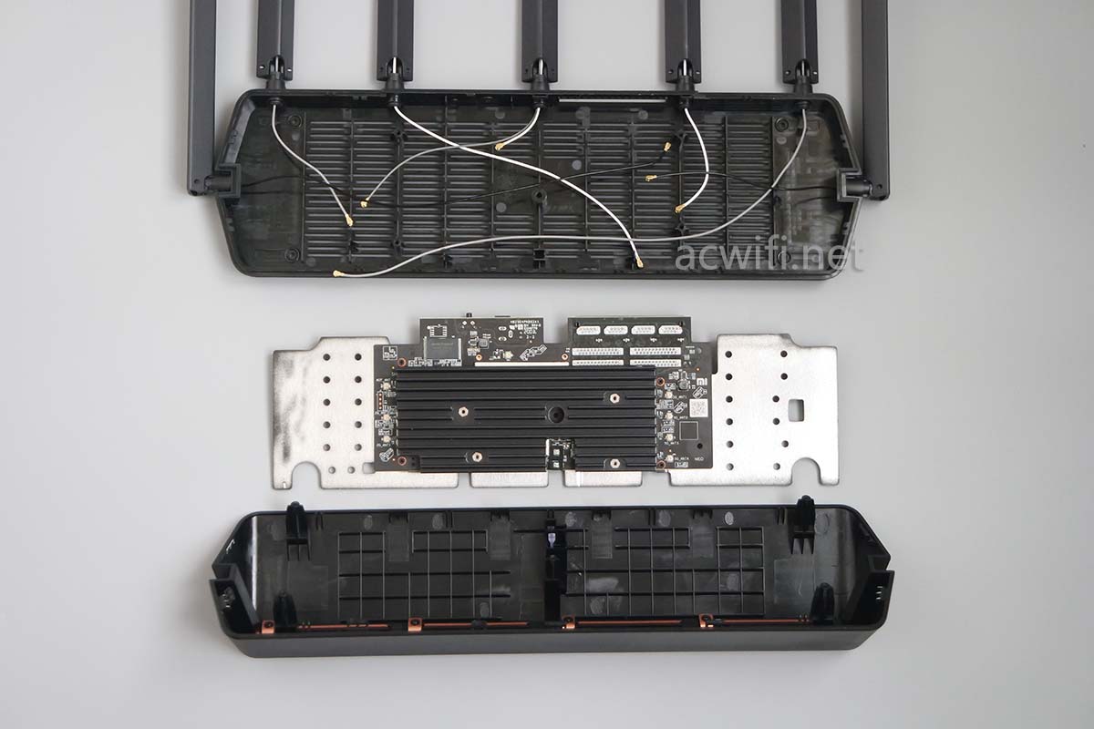The router is quite bulky actually. The 7 antennas are non-removable, 5 along the front and 2 at the sides. They can rotate and have detents in the upright and 45-degree positions. The center antenna has an LED indicator on top for the AIoT devices, which corresponds to the AIoT network status. From the teardowns, it seems like there is a dedicated radio SoC, the QCA9889, just for this network. You can see it in teardown photos, under the shield marked SH4 near the AOT_ANT antenna connector. This is somewhat good because the IoT radio can be tuned to separate channel(s) and have less load on the main WiFi network.